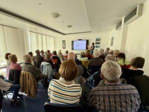 informierte über die frühzeitige Diagnose und Behandlung von Erkrankungen an der Hand wie die Dupuytrensche Kontraktur, wenn die Finger krumm werden, und die schmerzhafte Arthrose (Knorpelverschleiß) des Daumensattelgelenks. Wie bei ausgeprägtem Gelenkverschleiß eine Daumensattelgelenkprothese die Funktion und Beweglichkeit der Hand wieder herstellen kann, zeigte Frau Dr. Wenzel außerdem auf.